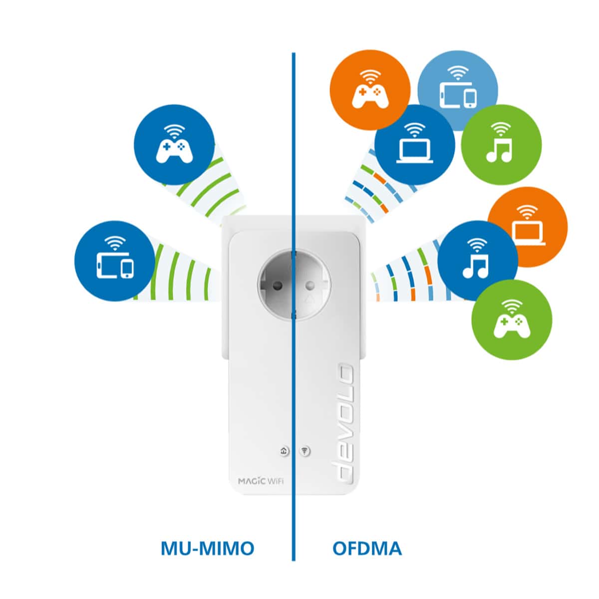 Während MU-MIMO der drahtlosen Datenautobahn weitere „Fahrspuren“ hinzufügt und so die gleichzeitige Versorgung von mehreren Endgeräten ermöglicht, bietet OFDMA durch flexible Nutzung dieser „Fahrspuren“ den effektivsten Transport der Datenpakete – für noch mehr Endgeräte! Dies führt bei paralleler Nutzung des WLAN-Netzes durch viele Endgeräte zu einem optimierten Datendurchsatz ohne spürbare Latenzen.